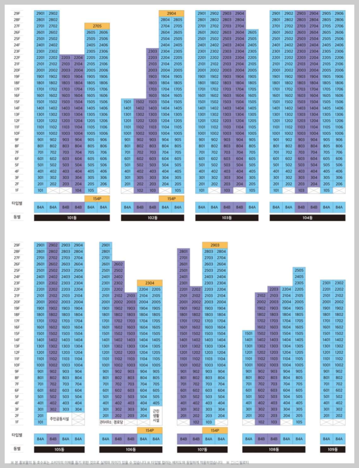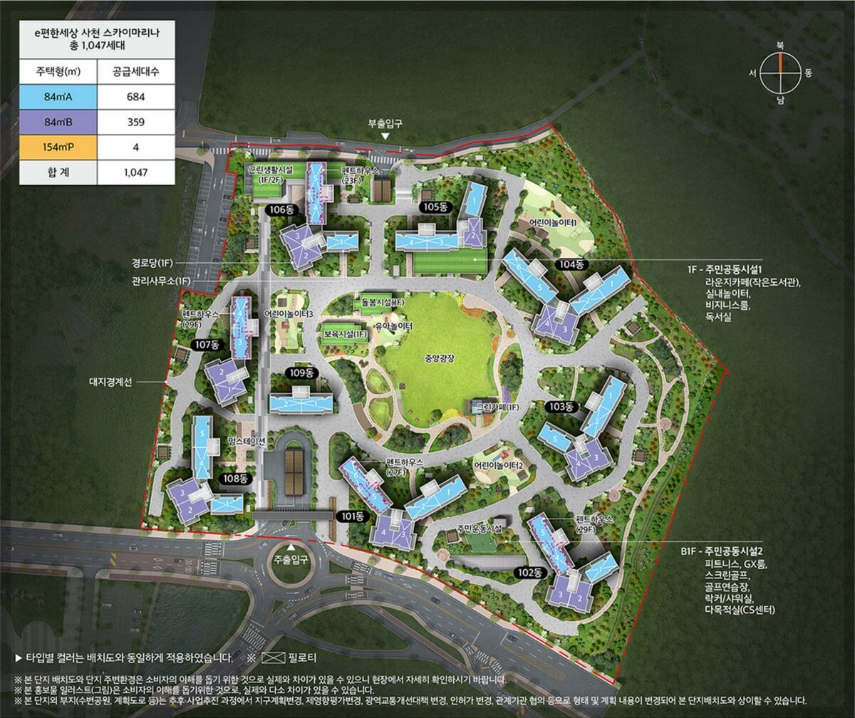총세대수: 1047세대(84㎡A형/684세대, 84㎡B/359세대/154㎡P형/4세대) 주차대수: 1,581대(근생 6대 포함)