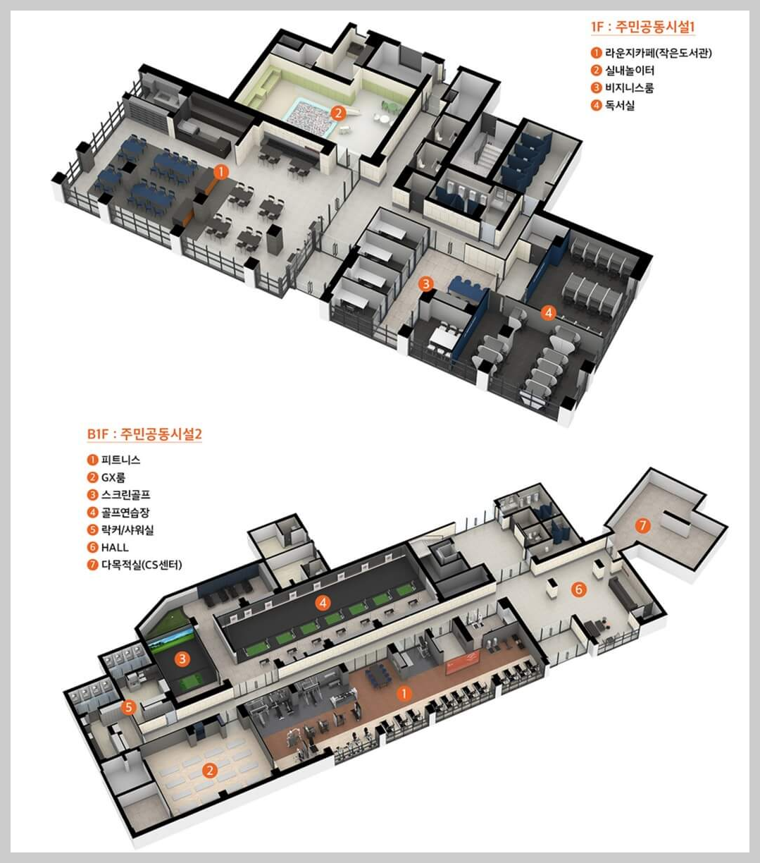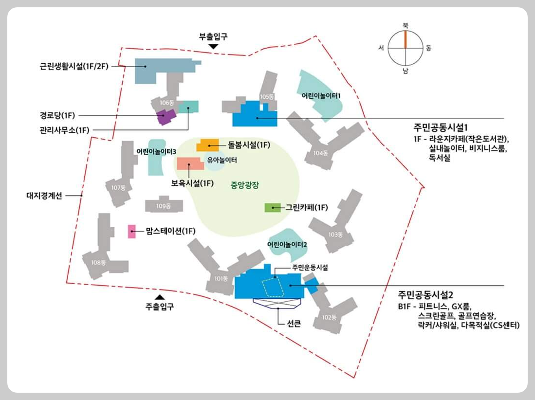 아파트 내에는 다양한 시설이 마련되어 있어 입주민들의 편안한 삶을 위해 기여합니다. 피트니스, GX룸, 스크린 골르, 골프연습장 등 여가 시설을 제공하며, 국공립 어린이집, 초등학교, 스터디룸 등 영유아부터 중고등학생까지를 위한 원스톱 교육특화 시설도 마련되어 있습니다.