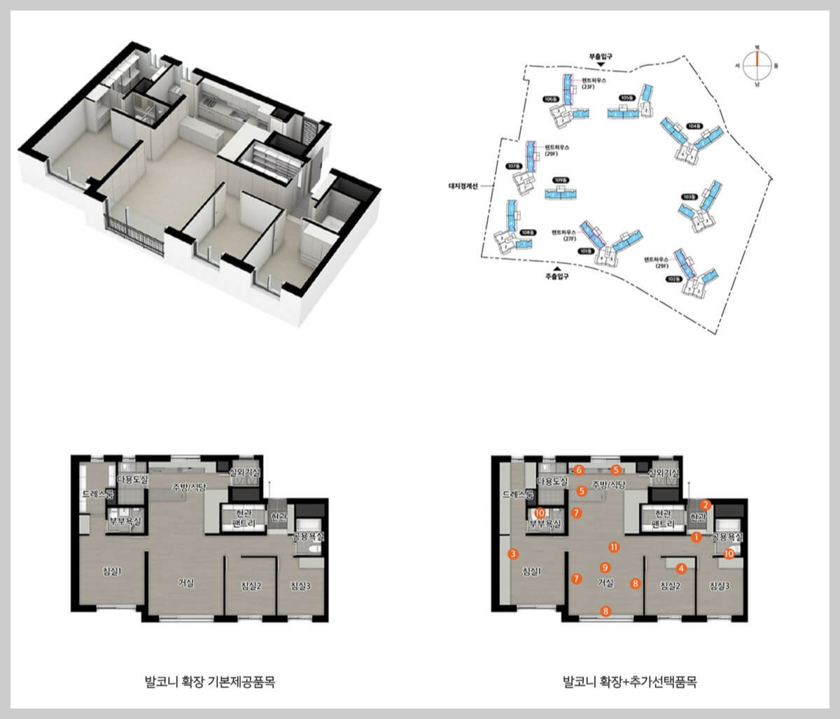 154㎡P형: 채광과 환기가 우수한 맞통풍 설계를 포함하고 있으며, 가족실, 알파룸, 주방 팬트리 등을 적용하여 최상층 펜트하우스로 삶의 격을 높입니다.