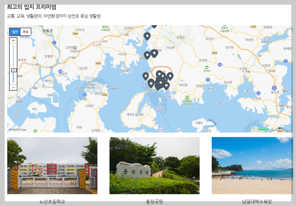 이 주거 단지의 입지는 굉장히 우수합니다. 삼천포 도심을 관통하는 주요 도로와 가까워, 이동이 편리합니다. 주변에는 홈플러스, 이마트, 하나로마트, 중앙시장 등 다양한 생활 편의 시설이 자리해 있으며, 문화 시설도 근처에 위치해 있어 다양한 활동을 즐길 수 있습니다.