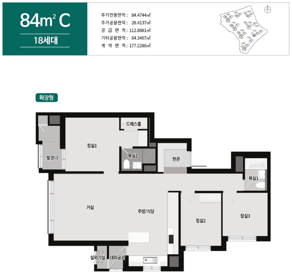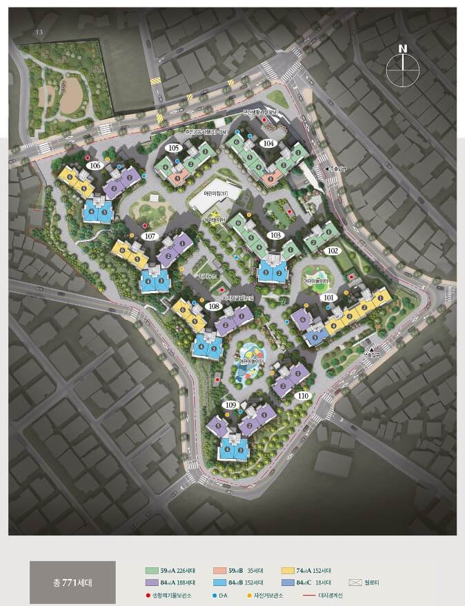 주택형: 59㎡A(226세대)/59㎡B(35세대)/74㎡A(152세대)/84㎡A(188세대)/84㎡B(152세대)/84㎡C(18세대)