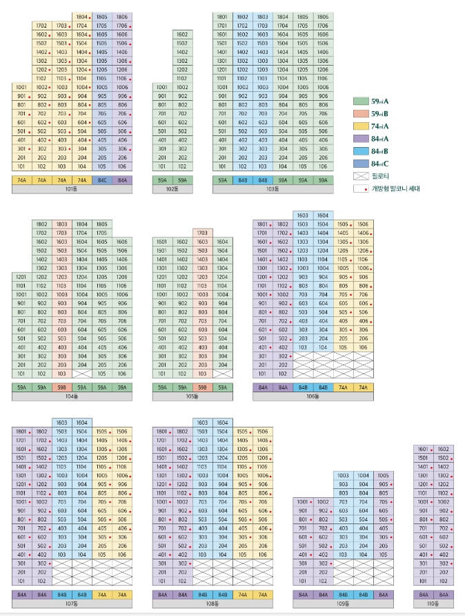 다양한 주택 형태: 59㎡A, 59㎡B, 74㎡A, 84㎡A, 84㎡B, 84㎡C 등 다양한 크기의 주택을 제공합니다.