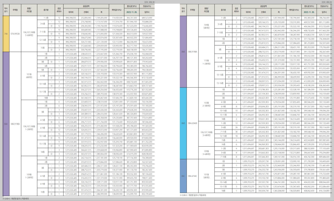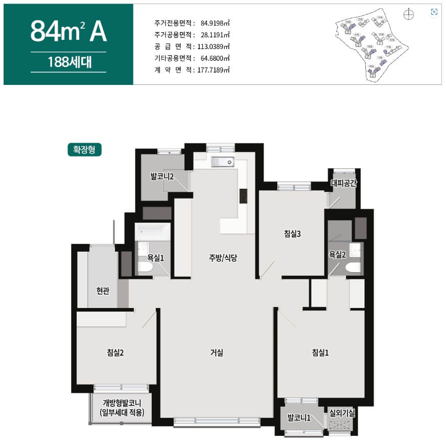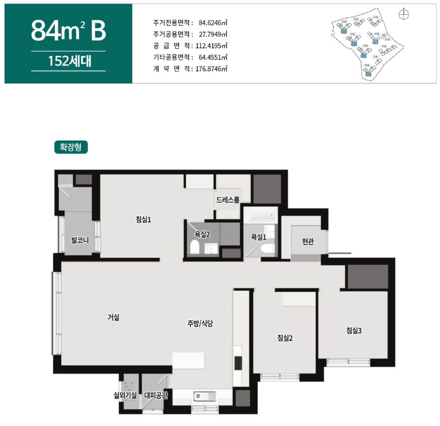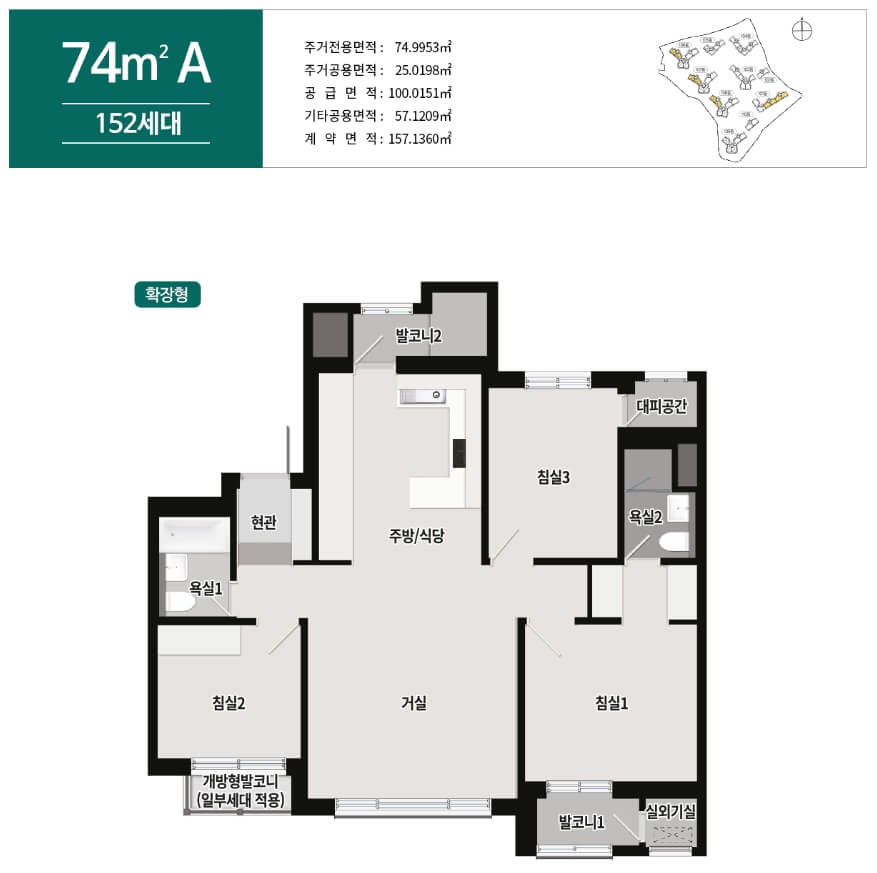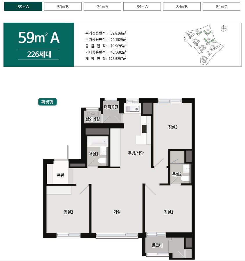 다양한 주택 형태: 59㎡A, 59㎡B, 74㎡A, 84㎡A, 84㎡B, 84㎡C 등 다양한 크기의 주택을 제공합니다.
