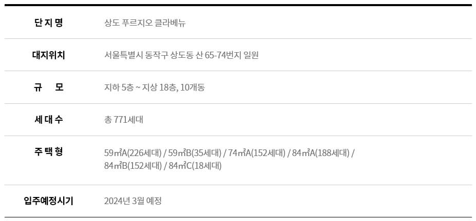 상도푸르지오 클라베뉴는 선시공 후분양 아파트로 총 771세대 규모로 구성되어 있으며 각 세대는 59~84㎡의 전용면적으로 구성되며 주차대수는 939대로 세대 1.22대 가능합니다, 또한 다양한 커뮤니티 시설이 들어설 예정입니다.