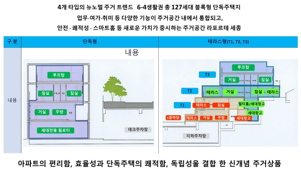 특히, 세종 라포르테는 세종시 행정중심복합도시 6-4 생활권 B1블록에 위치한 블록형 타운하우스로, 지하 1층~지상 3층 규모의 127세대로 구성되어 있습니다. 테라스형 54세대와 단독형 73세대가 조화를 이루며, 단지 전체가 지하주차장과 연결된 ‘차 없는 지상 공간’으로 설계되어 있습니다.