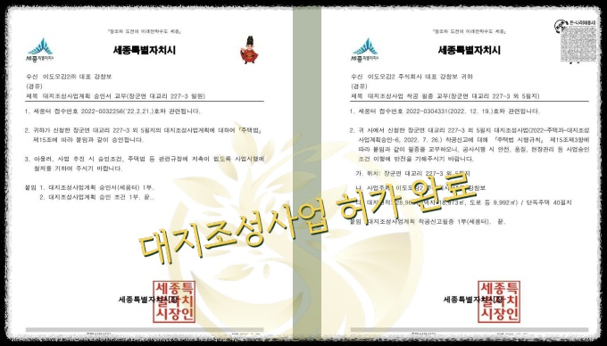 대지조성사업은 토목공사시 법정 진입도로 및 내부도로,인도,가로등,상.하수도,전기,통신,정화조,단지내 관리소, 주민공동시설, 공용주차장, 법벙 녹지면적등 관할시 주택가에 인.허가 심의 기준으로 조성되기 때문에 최적의 주거환경이 만들어 지며, 대지로 지목변경하여 소유권 이전등기를 합니다.