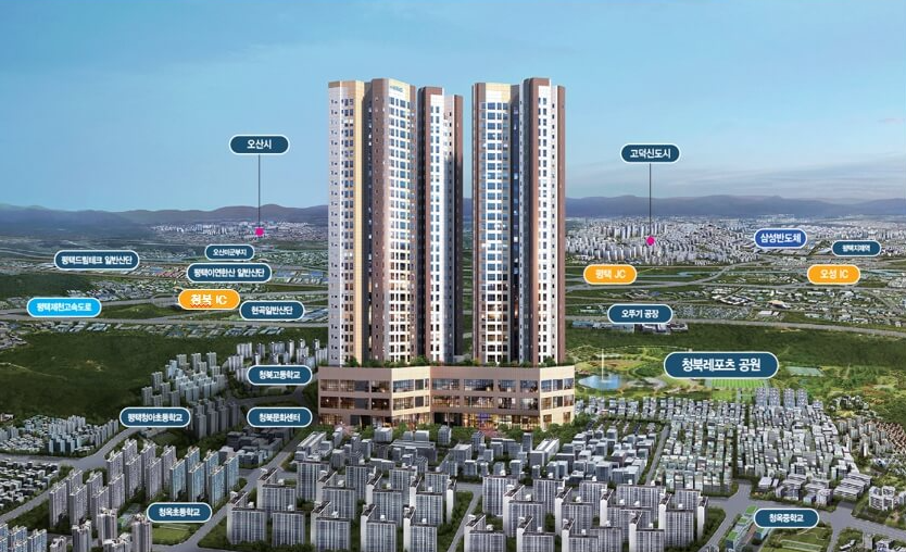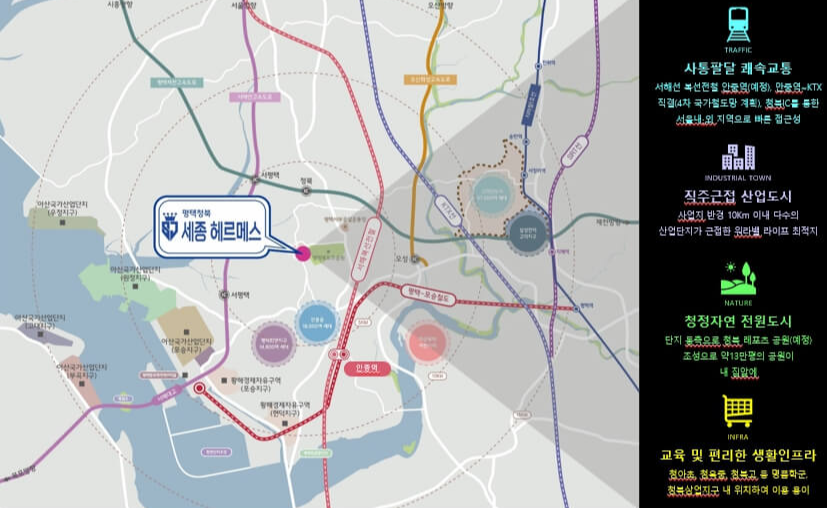 이 아파트는 경기도 평택시 청북읍에 위치하며, 약 44만㎡(13만 평)의 대규모 문화공원이 조성될 예정인 충북 레포츠공원(23년 예정)이 인근에 위치해 있습니다. 이는 아파트 입주민 280세대가 즐길 수 있는 고요한 자연환경으로 연결될 전망이며, 지역 내 교통 및 편의시설 인프라가 풍부하여 생활 편의성이 높습니다. 세종 헤르메스는 교통 및 편의시설 인프라가 뛰어난 지역에 자리하고 있어, 인근에는 대규모 아파트단지, 공원, 산업지구, 학교, 편의시설, 문화시설 등이 중심을 이루어 항아리 상권을 형성할 것으로 기대됩니다.