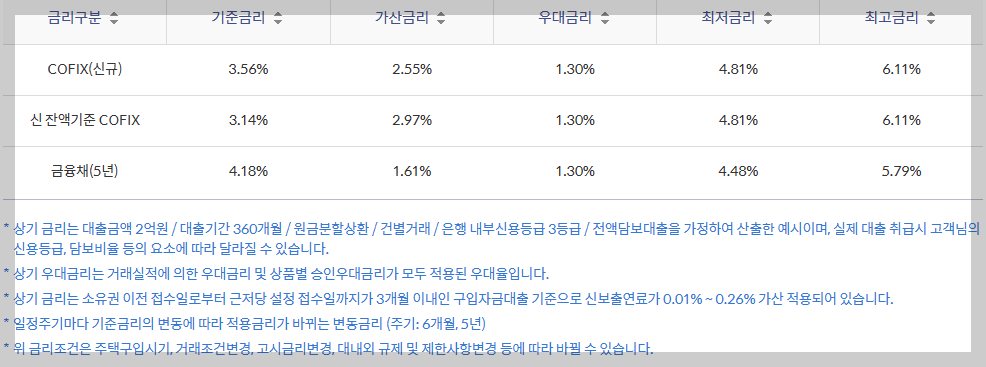 *기본금리(최고금리)에 우대금리가 적용되어(상품에 따라 우대금리 폭이 다르거나 없을 수 있음) 고객님의 금리가 결정되며 최저금리는 시장 및 고객님의 신용등급, 대출조건 등에 따라 변경될 수 있습니다.