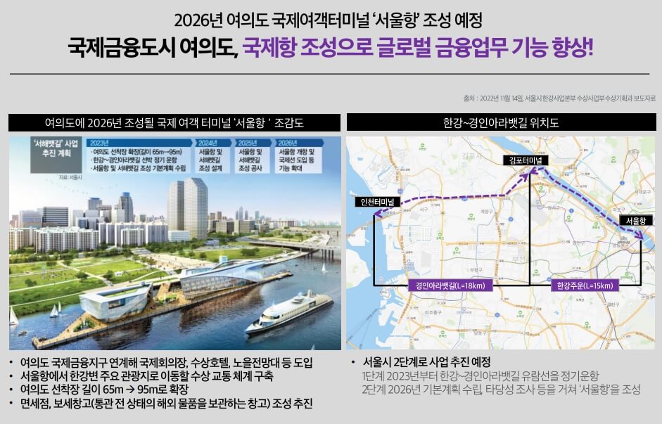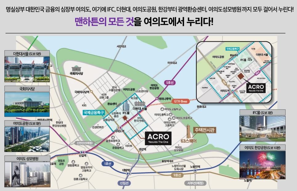 여의도의 입지는 수요자들에게 큰 호평을 받고 있습니다. 지하철 5·9호선 여의도역과의 인접성과 서울의 주요 업무지구로의 접근성이 뛰어나며, GTX-B, 서부선, 신안산선 개발호재가 추가로 기대되어 향후 더욱 가치를 높일 것으로 전망됩니다.