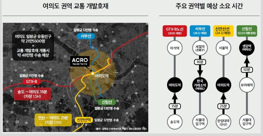 여의도의 입지는 수요자들에게 큰 호평을 받고 있습니다. 지하철 5·9호선 여의도역과의 인접성과 서울의 주요 업무지구로의 접근성이 뛰어나며, GTX-B, 서부선, 신안산선 개발호재가 추가로 기대되어 향후 더욱 가치를 높일 것으로 전망됩니다.