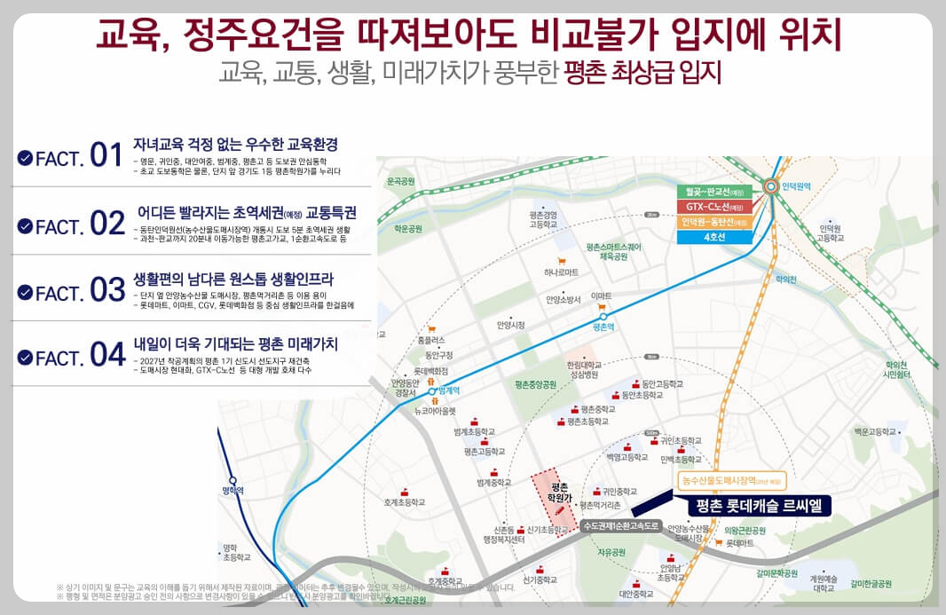 부동산 시장이 예측하기 어려운 시기일수록 사람들은 공통된 고민을 안고 있습니다. ‘앞으로 가치가 오를 곳은 어디인가?’, ‘안전하게 선택할 수 있는 입지는 무엇인가?’ 하는 문제입니다. 특히 실거주와 미래가치 모두를 고려해야 하는 요즘, 확신을 주는 입지를 찾기는 더욱 어려워졌습니다. 이러한 고민 속에서 많은 분들이 다시 시선을 돌리는 곳, 바로 평촌 신도시의 중심 입지입니다. 오늘은 이 고민에 대한 해답으로 떠오르는 단지 평촌 롯데캐슬 르씨엘의 핵심 가치를 쉽게 정리해 드리겠습니다.