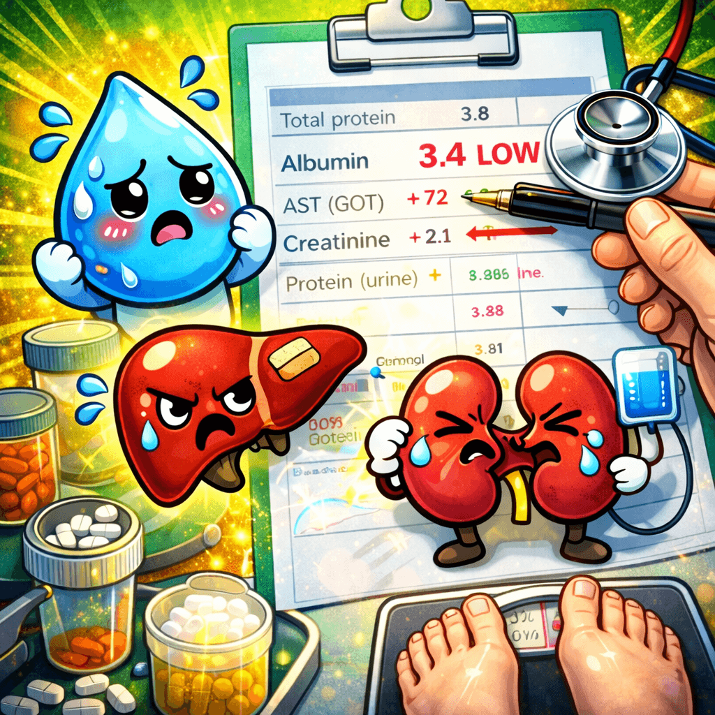 함께 볼 항목: 총단백(TP), 간수치(AST/ALT), 단백뇨 여부 주의 증상: 손발 부종, 유독 심한 소변 거품, 극심한 피로감