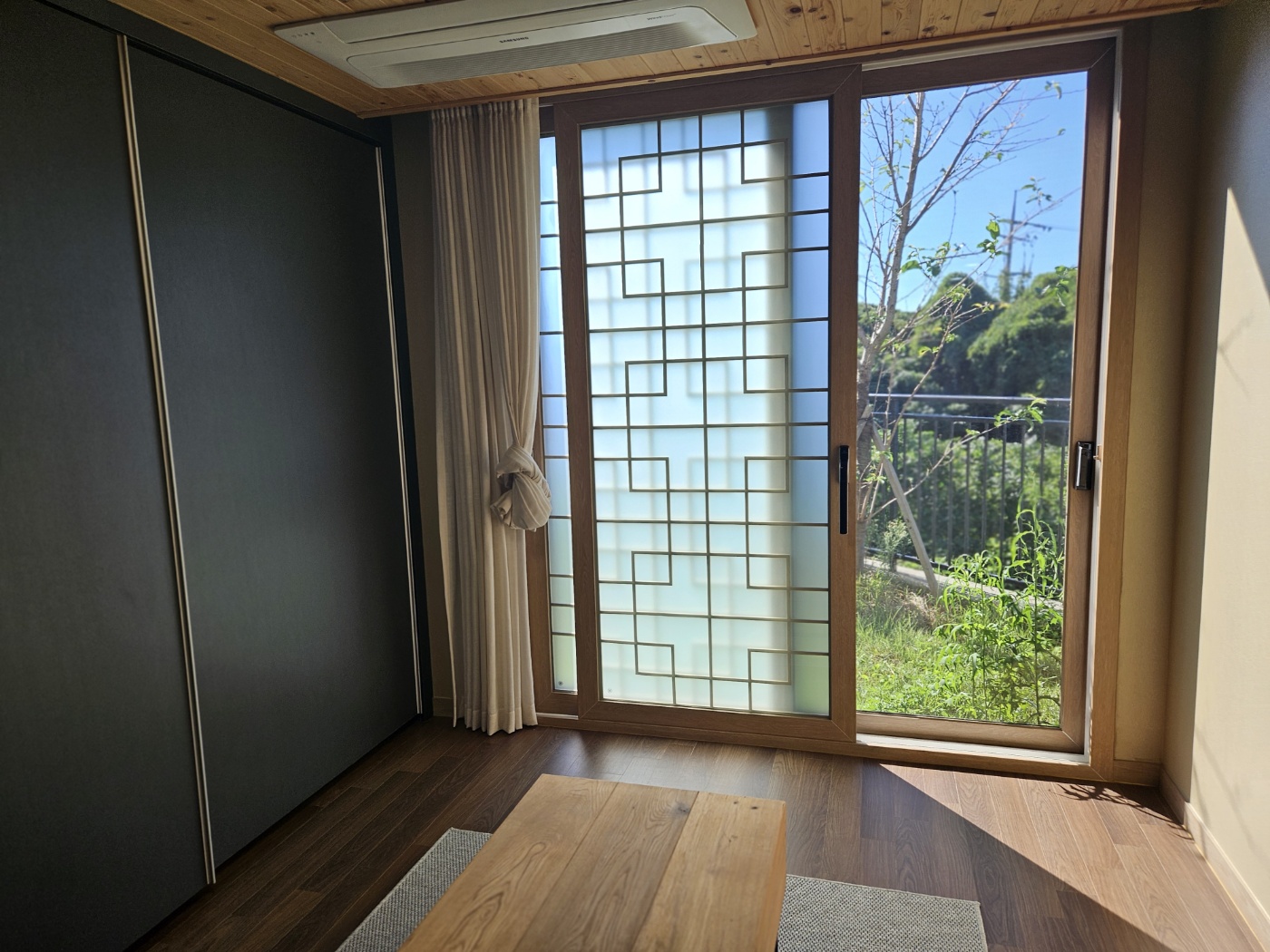 전통미: 한식 황토벽지와 한옥 격자 창문으로 전통적인 아름다움을 살린 디자인.