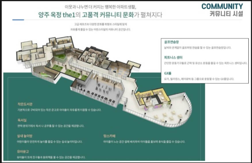이웃과 나누면서 더 커지는 행복한 아파트 생활, 양주옥정 THE1의 고품격 커뮤니티 문화가 펼쳐지다 고급 레포츠와 다양한 문화를 취향과 스타일에 맞게 자유롭게 즐길 수 있는 어반스타일의 커뮤니티 공간입니다.