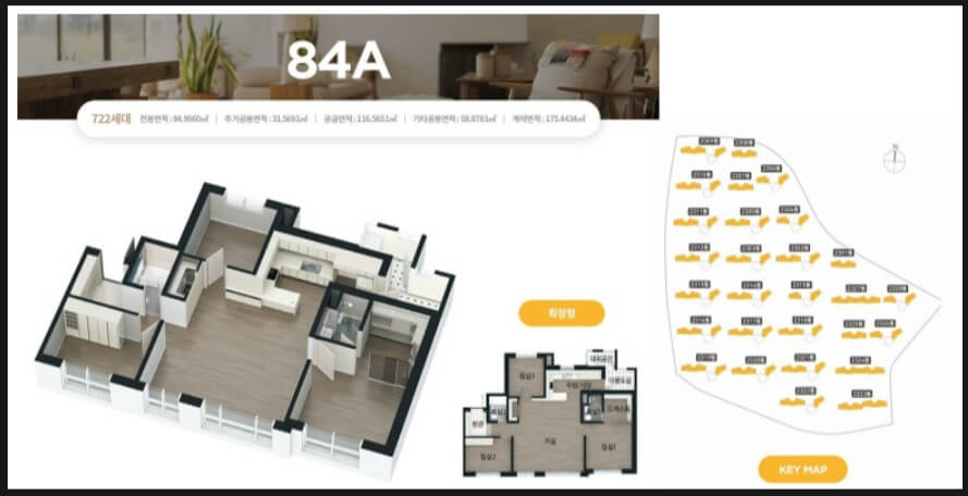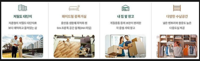 내부 공간의 혁신: 안방 확장과 공간 활용 이 단지는 안방 공간을 확장시키는 특화 설계를 도입하여 주거 공간의 활용도를 높였다. 특히, 안방에서도 타 단지 거실 뷰를 즐길 수 있는 장점을 가지고 있으며, 에어컨 실외기를 배치할 수 있는 별도의 공간과 세대 공용창고 등이 마련되어 있다.