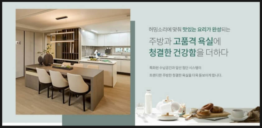 허밍소리에 맞춰 맛있는 요리가 완성되는 주방과 고품격 욕실에 청결한 건강함을 더하다.