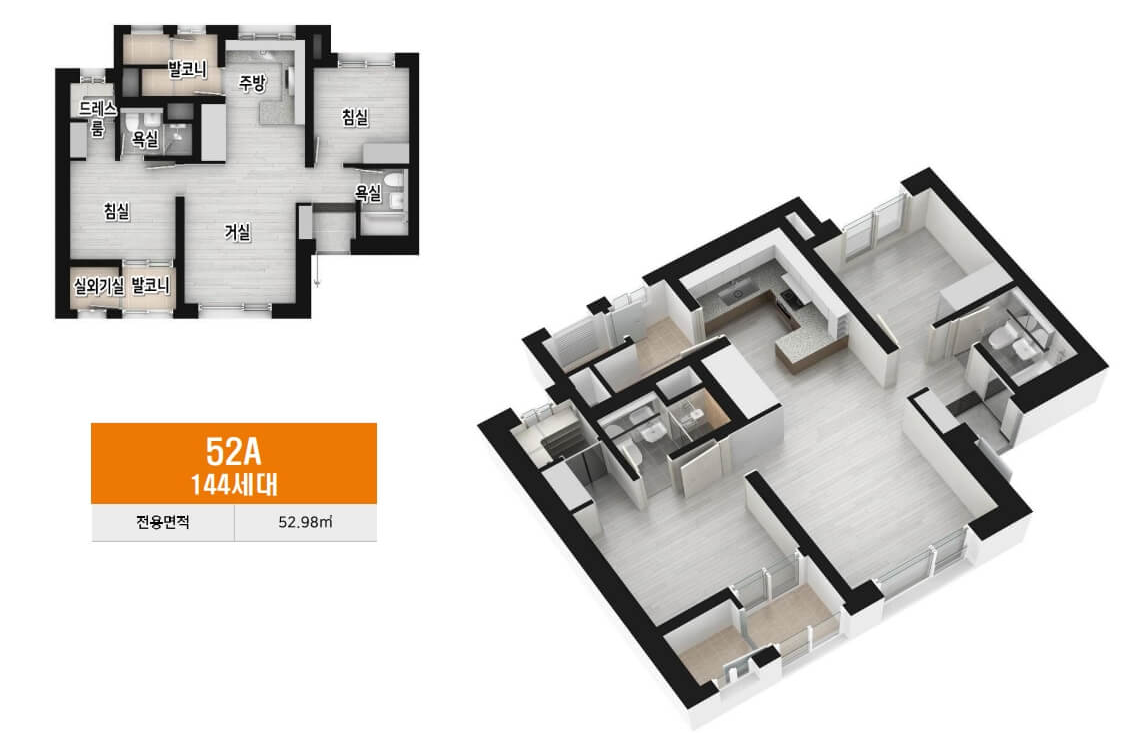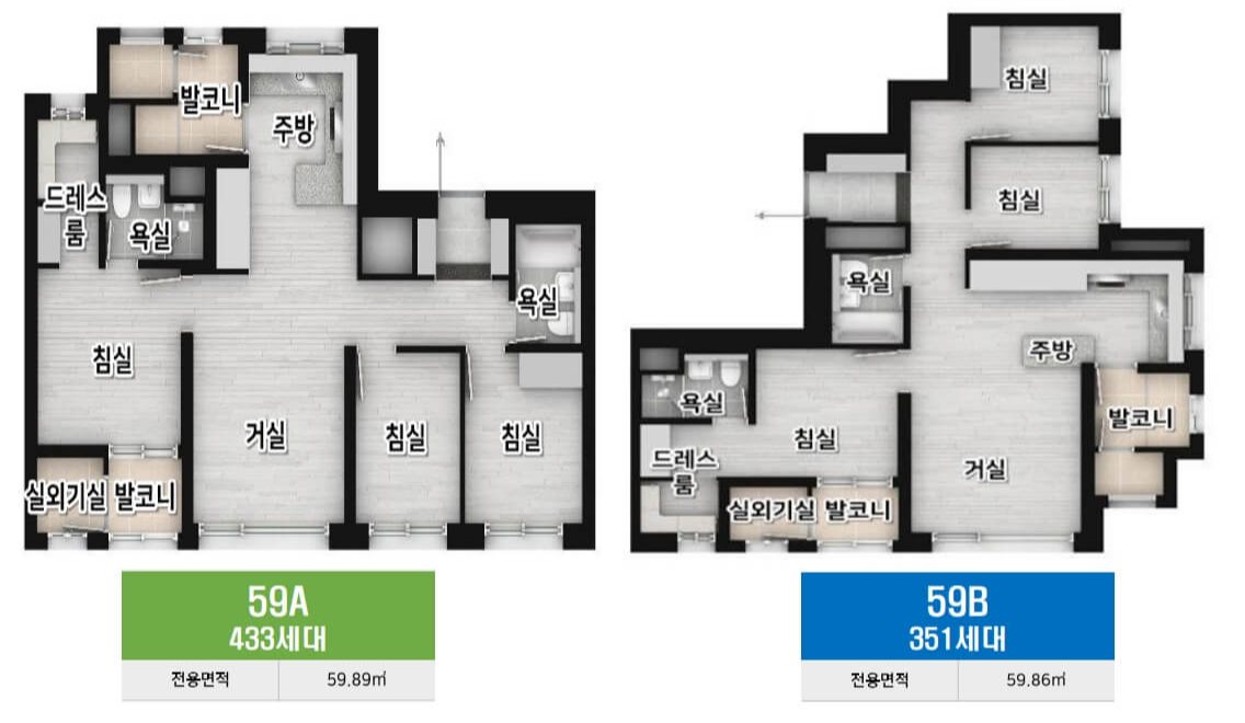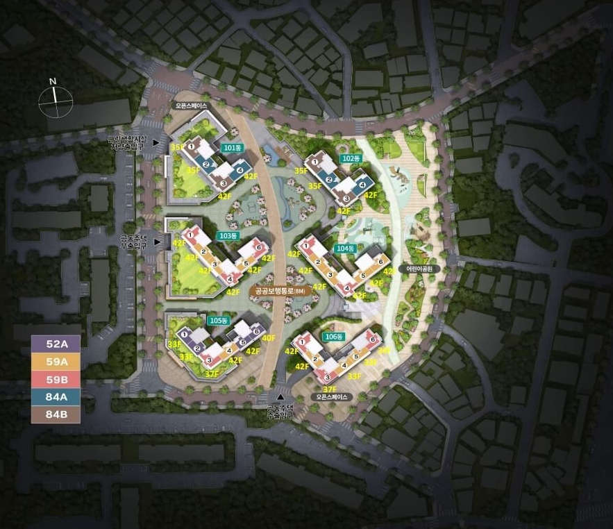 이 아파트는 실수요층의 니즈를 충실히 반영한 전용 52㎡, 59㎡, 84㎡ 중심의 중소형 타입으로 구성되어 있습니다. 특히 59형이 전체 1,228세대 중 784세대로 가장 많은 비중을 차지해, 신혼부부와 3~4인 가족 단위 수요층을 겨냥했습니다.