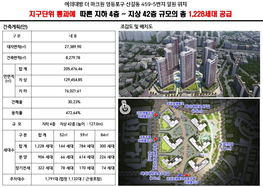 여의대방 더마크원은 영등포구 신길동 459-5번지 일원에 들어서는 대규모 주거 단지로, 지하 4층~지상 42층, 총 6개 동, 1,228세대 규모의 초고층 아파트입니다. 이 단지는 여의도 중심업무지구(YBD)와 한 정거장 거리로, 직주근접성과 생활 인프라를 모두 충족시키는 입지를 자랑합니다.