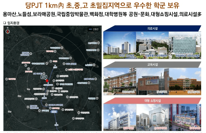 생활 인프라도 풍부합니다. 더 현대 서울, 타임스퀘어, 롯데백화점, 이마트 등 대형 쇼핑몰이 인접해 있고, 샛강생태공원, 보라매공원, 용마산, 노들섬 등 자연 휴식 공간도 가까워 도심 속 여유로운 생활이 가능합니다. 인근에는 여의도성모병원, 보라매병원, 강남성심병원 등 종합병원도 포진해 있습니다.