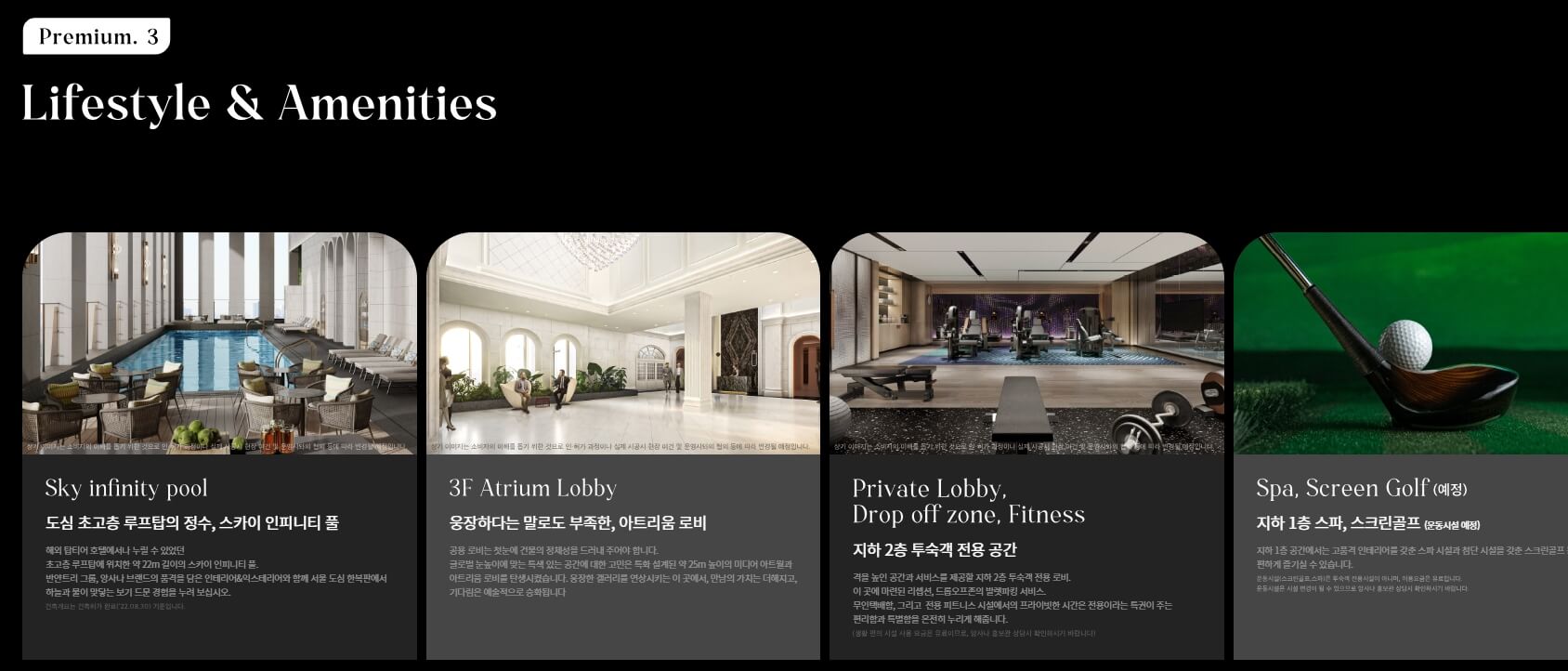 입주민을 위한 호텔식 서비스도 대거 제공됩니다. VVIP 비서 서비스, 홈 버틀러 서비스, 조식 서비스는 물론 발레 파킹, 리무진, 케이터링 서비스가 포함된 고급스러운 생활 지원이 제공됩니다. 또한, 스파, 골프 연습장 등 다양한 커뮤니티 시설이 지하 1층에 마련되어 입주민들의 여가 생활을 지원하며, 세차 및 세탁, 프리미엄 물품 보관, 마켓 공동 구매 등의 리빙 서비스도 갖추어져 있습니다.