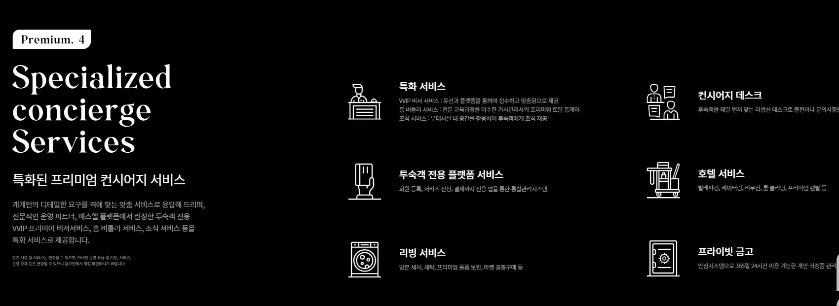 레지던스는 전용 플랫폼 앱을 통해 생활 편의와 보안 서비스를 통합 관리할 수 있어 편리함을 극대화합니다. 투숙객 전용 플랫폼에서는 회원 등록과 서비스 신청, 결제가 가능하며, 지하 2층의 컨시어지 데스크에서는 입주민의 각종 문의사항을 해결해 주는 전문 서비스가 제공됩니다. 또한, 3층에는 프라이빗 금고가 마련되어 입주민의 귀중품을 안전하게 관리할 수 있습니다.