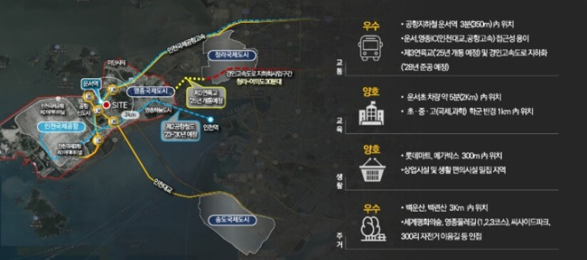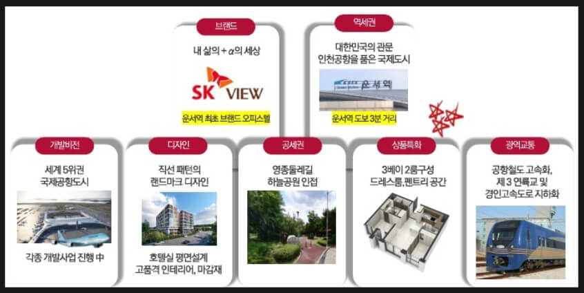 영종 SK VIEW는 인천국제공항과 가까운 위치에 있어 각국 항공 관련 사업 관련자, 공항 직원 등 약 2만 6000여 명의 상주 근로자뿐만 아니라 주변 복합리조트 등의 근무자들을 배후수요로 예상할 수 있습니다. 또한, 교통 또한 매우 편리합니다. '영종 SK VIEW'는 공항철도 운서역에서 도보 3분 거리에 위치해 있어 인천공항, 김포공항, 서울역, 홍대입구역 등 수도권 주요 지역으로 환승 없이 편리하게 이동할 수 있습니다. 제2경인고속도로, 영종대교, 인천대교 등을 통해 서울과 수도권 전역으로 이동하기도 용이합니다. 또한, 2025년 제3연륙교가 개통되면 서울 여의도까지 빠르게 이동할 수 있게 될 것입니다.