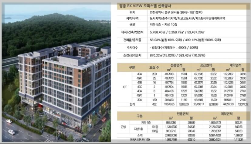 인천 영종국제도시 주변에서 개발된 영종 SK VIEW는 주거용 소형 오피스텔로 구성되어 수요가 증가할 것으로 예상됩니다. 이 오피스텔은 지하 5층부터 지상 10층까지의 규모를 가지며, 전용면적은 39~49㎡에 432실로 구성되어 있습니다. 영종 SK VIEW의 가장 큰 장점은 영종국제도시의 중심부에 위치하고 있다는 점입니다. 오피스텔 주변에는 파라다이스시티, 인스파이어 등 초대형 복합리조트, 제3연륙교, 한상드림아일랜드 등이 들어서 있거나 공사 중입니다.
