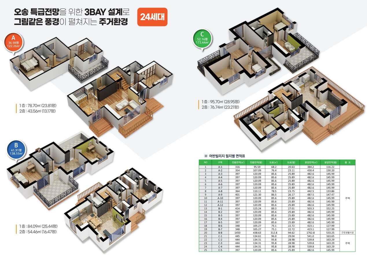오송 개발특구의 마지막 기적, 프리미엄 타운하우스의 완벽한 선택 오송 생명과학국가산업단지 내 오송 어반 빌리지 타운하우스는 처음이자 마지막으로 공급되는 25필지로, 도심과 자연이 어우러지는 완벽한 주거환경을 누릴 수 있습니다. 또한 오송어반빌리지의 다양한 면적과 구조를 가진 단독주택형 타운하우스이며, 입주자의 성향과 가족 구성원에 따라 122.2㎡(구 37평), 138.5㎡(구 42평), 172.4㎡(구 52평)의 3가지 면적과 5가지 타입 중에서 선택할 수 있으며, 나만의 설계가 가능한 단독형 타운하우스입니다.