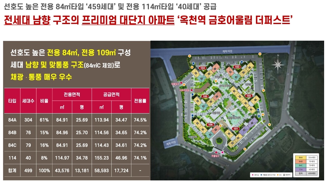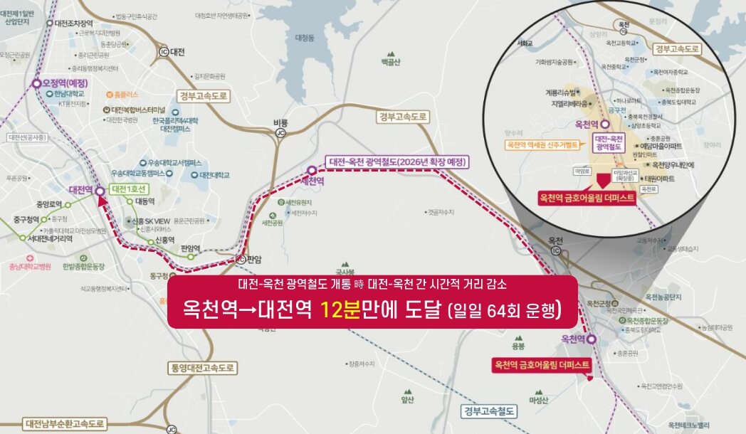 옥천광역철도 개통 예정인 2026년을 중심으로 한 옥천 역을 중심으로 한 도시개발 계획에 대한 단기 및 중장기 실행방안을 마련하는 계획입니다. 이를 위해 옥천군은 2025년 2월까지 진행될 '옥천역세권 개발 타당성 조사 및 기본구상 용역'에 2억 1800만 원을 투입할 예정입니다. 금호건설은 현재 옥천역 역세권 인근에 위치한 대단지인 '옥천역 금호어울림 더퍼스트' 아파트의 잔여세대를 선착순 동호수 지정 방식으로 분양 중입니다. 옥천군 옥천읍 마암리 외 8필지 일대에 연면적 7만 6807㎡에 지하 1층에서 최고 지상 21층 6개동으로 구성되며, 전용면적 84㎡와 114㎡의 4개 타입으로 총 499세대를 공급할 예정입니다.