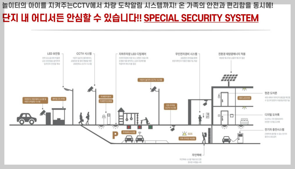 단지는 스마트폰이나 스마트홈 시스템을 통해 난방 등 집안의 주요 시설부터 가전제품까지 원격 제어가 가능하며, 특화된 CCTV 시스템을 도입하였습니다. 또한, 주민을 위한 다양한 공동시설로는 피트니스 센터, GX룸, 골프 연습장, 도서관, 어린이집, 경로당, 맘스카페 등을 조성하였습니다.