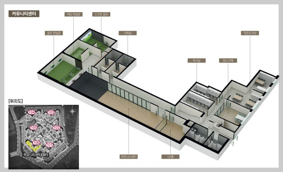 주민을 위한 다양한 공동시설로는 피트니스 센터, GX룸, 골프 연습장, 도서관, 어린이집, 경로당, 맘스카페 등이 조성되어 있습니다.