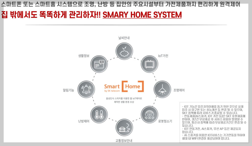 스마트폰이나 스마트홈 시스템을 통해 난방 등 집안의 주요 시설부터 가전제품까지 원격 제어가 가능합니다.