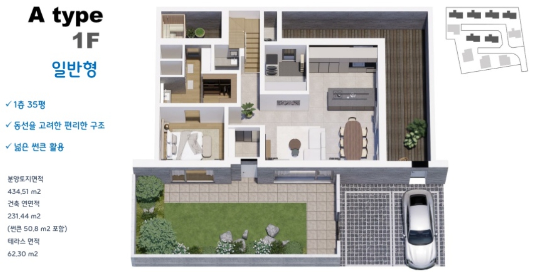 용인 수지 타운하우스 고기동 모스만코트 분양은 용인 수지구의 고품격 하이엔드 타운하우스, 모스만코트를 소개합니다. 이 곳은 대지면적 4721㎡, 연면적 1894.34㎡로 건폐율 19.68%, 용적률 20.38%의 공간에 지하1층부터 지상 3층까지, 총 11동으로 이루어져 있습니다.