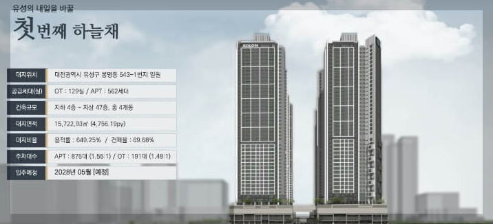 유성구의 새로운 랜드마크, 유성구 봉명동에 들어설 유성 하늘채 하이에르가 뜨거운 관심을 받고 있습니다. 대전광역시 유성구 봉명동 543-1번지 일원에 위치하며, 지하 4층~지상 47층의 고층 구조로 총 4개 동에 걸쳐 조성될 예정입니다. 지역 내에서도 랜드마크로 주목받는 만큼 그 가치와 입지는 눈에 띄는 곳입니다. 특히 코오롱 브랜드 프리미엄을 갖춘 점, 그리고 유성구 내 희소한 대형 평형 신축 아파트라는 점에서 앞으로의 가치 상승이 기대됩니다. 탁월한 입지와 풍부한 인프라 유성 하늘채 하이에르는 슬세권과 편리한 교통망을 동시에 갖춘 최적의 위치에 자리 잡고 있습니다.