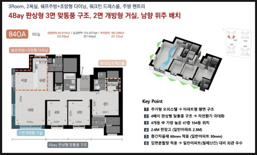 팬트리, 알파룸, 드레스룸 등 실용적 공간 활용이 돋보이며, 일부 세대는 4베이 판상형 구조로 채광과 통풍이 우수합니다.