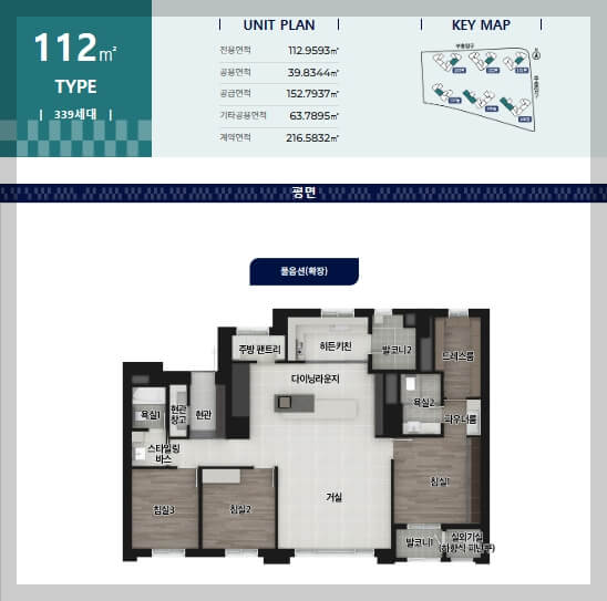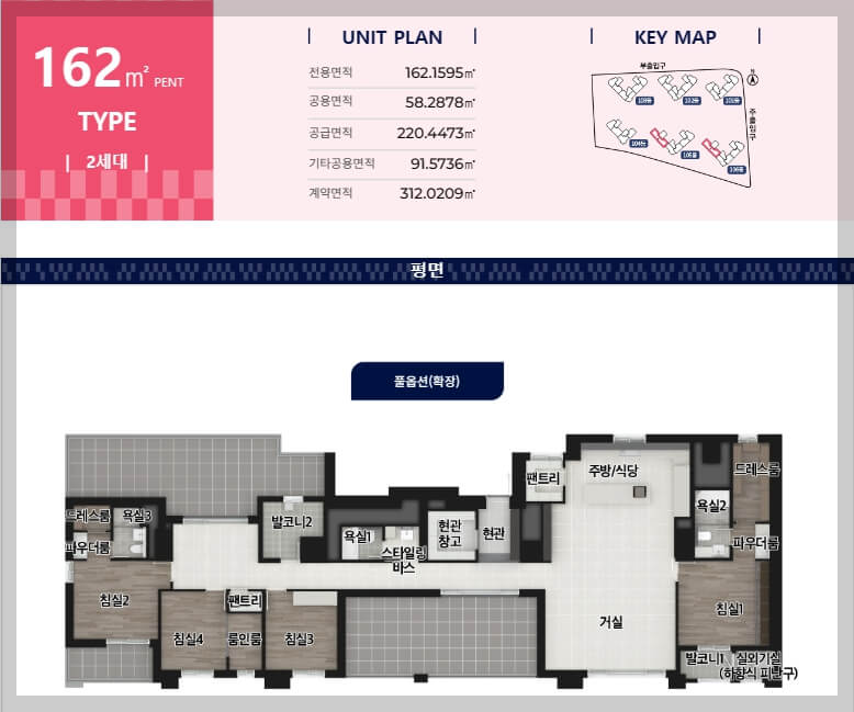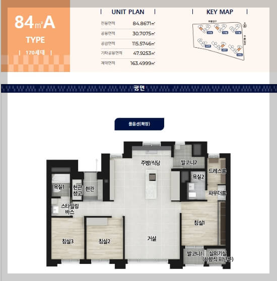 다양한 평형을 제공하는데, 84㎡ 5가지 타입과 85㎡ 초과의 중대형 평수가 있습니다.