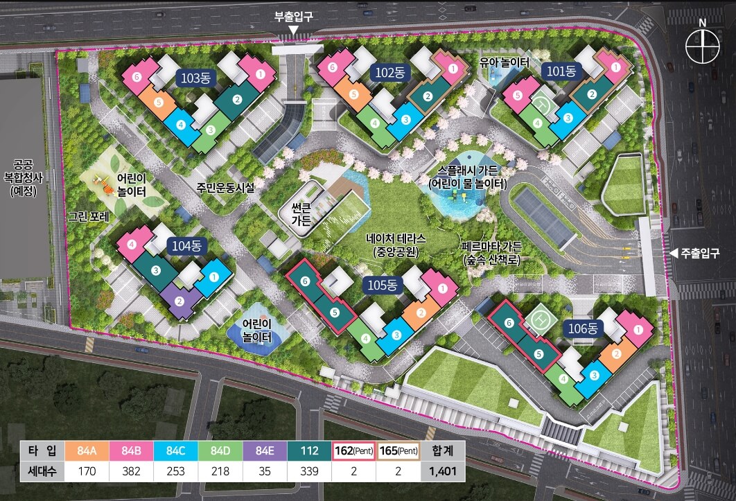 지하 3층에서 지상 48층까지 6개동, 1,401세대로 구성됩니다.