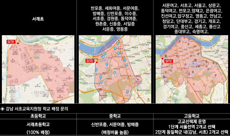 이 지역은 국내 학군 순위 상위 지역으로 교육환경이 우수합니다. '인시그니아 반포' 인근에는 서래초, 세화여중고, 세화고를 비롯한 학교들이 있으며, 국립중앙도서관 및 반포도서관도 이용 가능합니다. 또한, 반포 학원가도 인근에 위치하여 학교 시설 및 교육 환경이 풍부합니다.