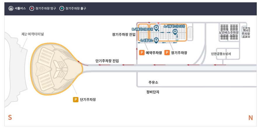 제2여객터미널과 주차장 간의 거리가 먼 경우, 무료 셔틀 서비스를 제공하여 여행자들의 이동을 편리하게 지원합니다.
