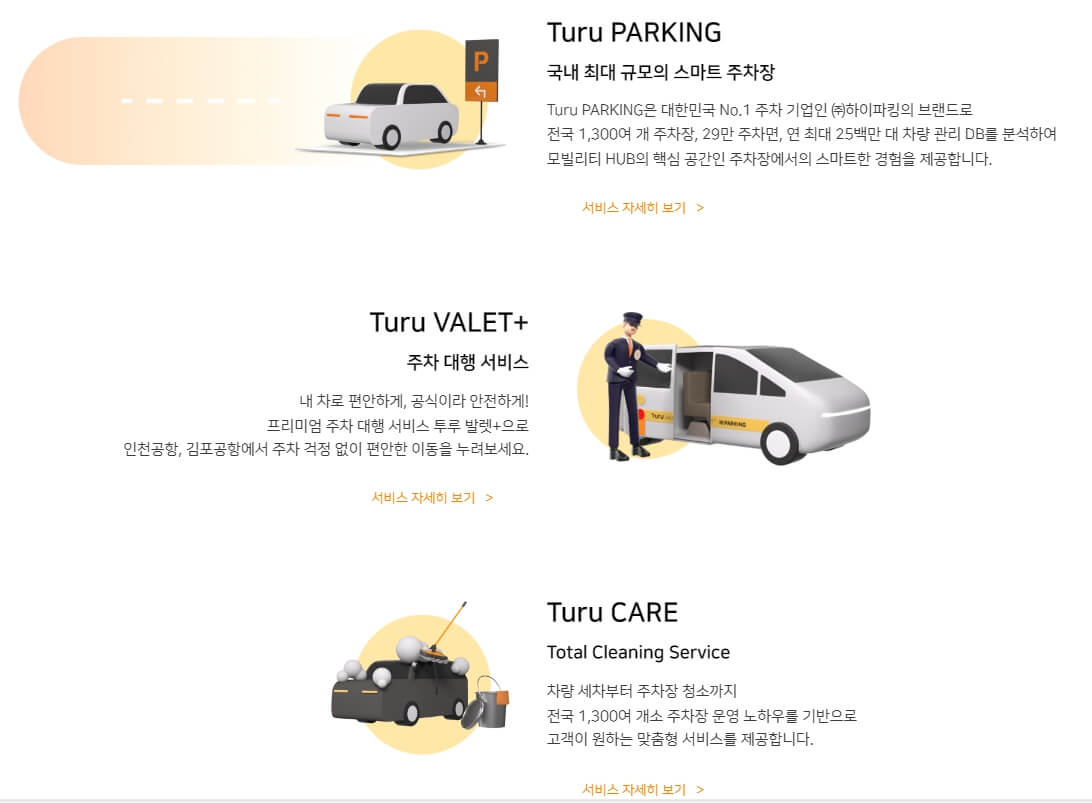 ㈜하이파킹의 Total Cleaning Service ‘Turu CARE’는 차량 세차부터 주차장 청소까지 전국 1,300여 개소 주차장 운영 노하우를 기반으로 고객이 원하는 맞춤형 서비스를 제공합니다.