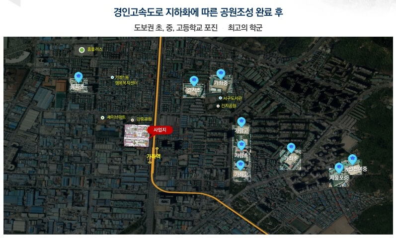 인천 구간의 경인고속도로 지하화 사업이 국토부 투자 심의를 통과하여 진행될 예정입니다. 경인고속도로 지하화가 완성되면 상부에는 대단위 공원이 조성되어 도시 확장성과 환경 개선에 기여할 것입니다. 이러한 개발 계획은 가좌역 주변을 더욱 살기 좋은 공간으로 변화시키고 생활 중심지로서의 가치를 더욱 높일 전망입니다.