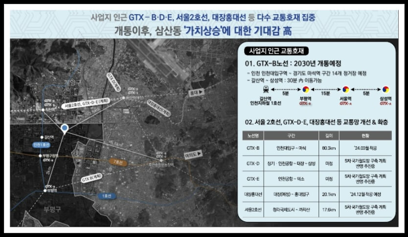 더불어 GTX-B 노선(예정), GTX-D·E 노선(계획), 대장홍대선(예정) 등 광역 교통망이 추가로 구축될 예정이어서 미래가치는 더욱 상승할 전망이다.