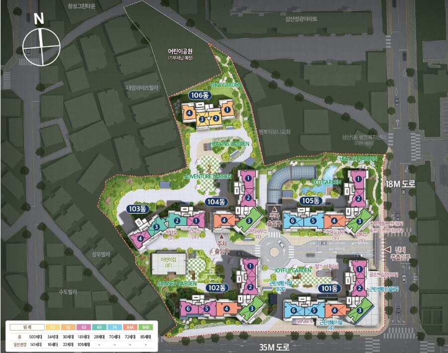세대수 총 500세대(임대 18세대 포함) 중 일반분양 141세대