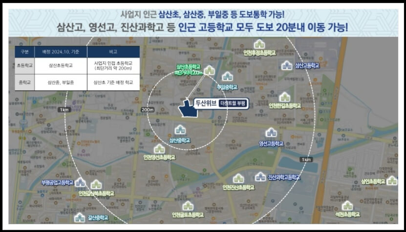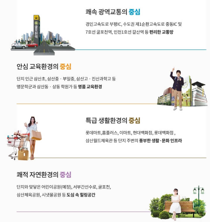 교육 인프라도 우수하다. 삼산초, 삼산중, 부일중이 도보 거리에 있으며, 단지 반경 1km 내에는 영선고, 삼산고, 진산과학고 등 명문 학교들이 자리 잡고 있다. 또한 삼산동과 상동 학원가로 이동이 용이해 자녀의 학습 환경을 중시하는 학부모들에게 특히 매력적이다.