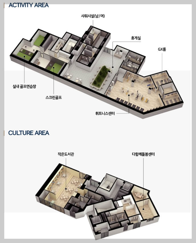 부대시설: 휘트니스센터, 실내골프연습장, 스크린 골프연습장, 샤워실, 작은 도서관, 어린이집, 다 함께 돌봄 센 테, 경로당 등