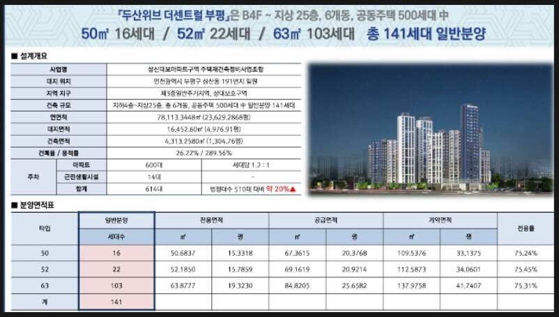 인천광역시 부평구는 노후 주택 비율이 70% 이상에 달해 신축 아파트의 희소가치가 크게 부각되고 있다. 특히 신축 아파트가 높은 프리미엄과 더불어 신고가를 경신하며 주목받고 있는 가운데, 두산건설이 공급하는 두산위브 더센트럴 부평이 새로운 관심 대상으로 떠오르고 있다. 해당 단지는 교통, 교육, 자연환경, 생활 인프라를 모두 갖춘 뛰어난 입지 조건으로 주목받고 있다. 부평구는 노후 주택 비율이 높은 지역으로 신축 아파트의 희소성이 높습니다. 이로 인해 신축 아파트들은 지속적으로 신고가를 경신하며 주택 시장에서 강세를 보이고 있다. 또한 2022년 입주한 부평구 산곡동의 ‘두산위브 더 파크’ 전용 74㎡(19층)도 2023년 8월에 6억 4,300만 원에 거래되며 약 2억 원의 웃돈이 붙었다. 이처럼 부평구 신축 아파트는 높은 수익률과 시장성을 자랑하고 있습니다. 두산위브 더센트럴 부평은 삼산대보아파트구역 주택 재건축정비사업으로 공급되는 단지로, 부평구 삼산동에 위치한다. 이 단지는 지하 4층에서 지상 최고 25층까지 총 6개 동, 500세대 규모로 조성됩니다. 특히 전용면적 50㎡~63㎡의 소형 평형대 141세대가 일반 분양 예정으로, 실수요자와 투자자 모두에게 매력적인 선택지가 될 전망이다. 부평구는 브랜드 아파트가 상대적으로 적은 지역으로, 두산위브 더센트럴 부평은 브랜드 가치와 희소성을 동시에 갖춘 단지로 자리매김할 가능성이 높습니다.