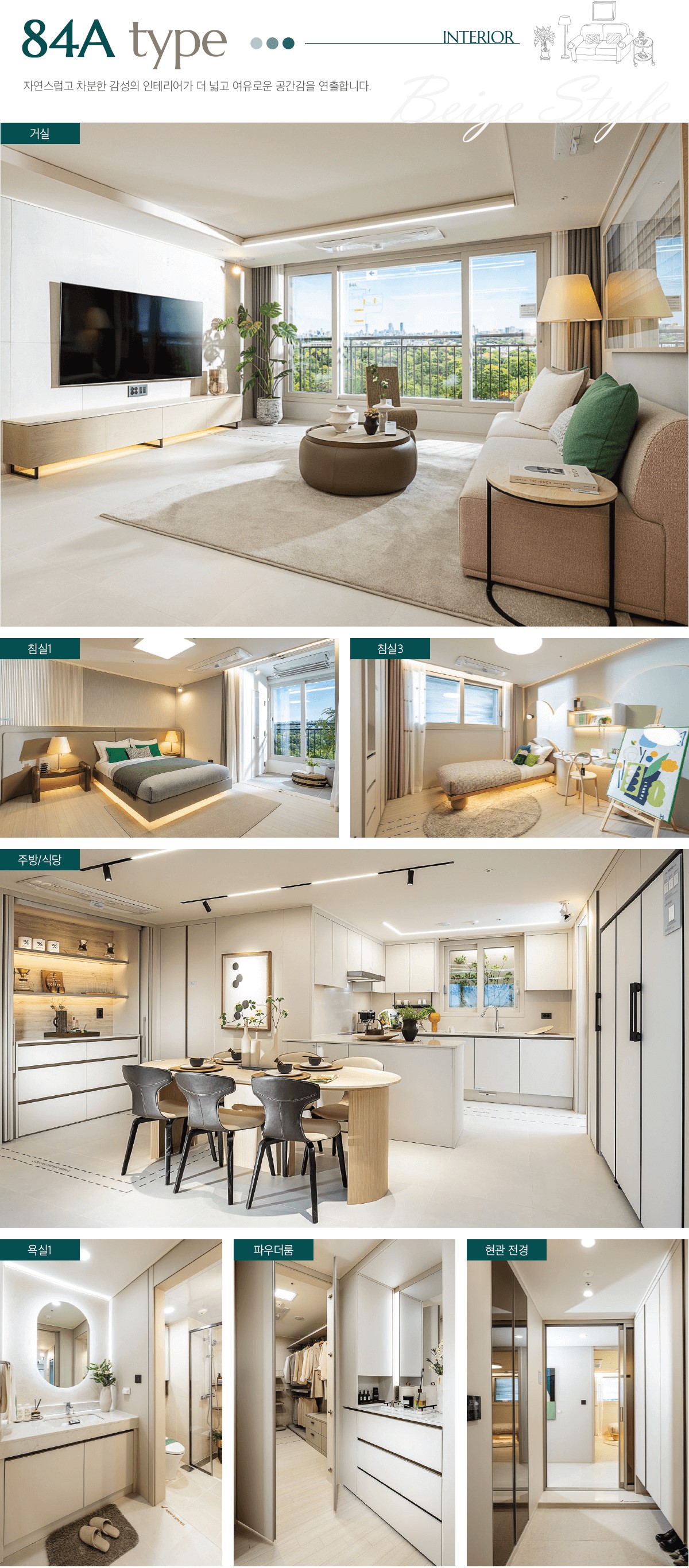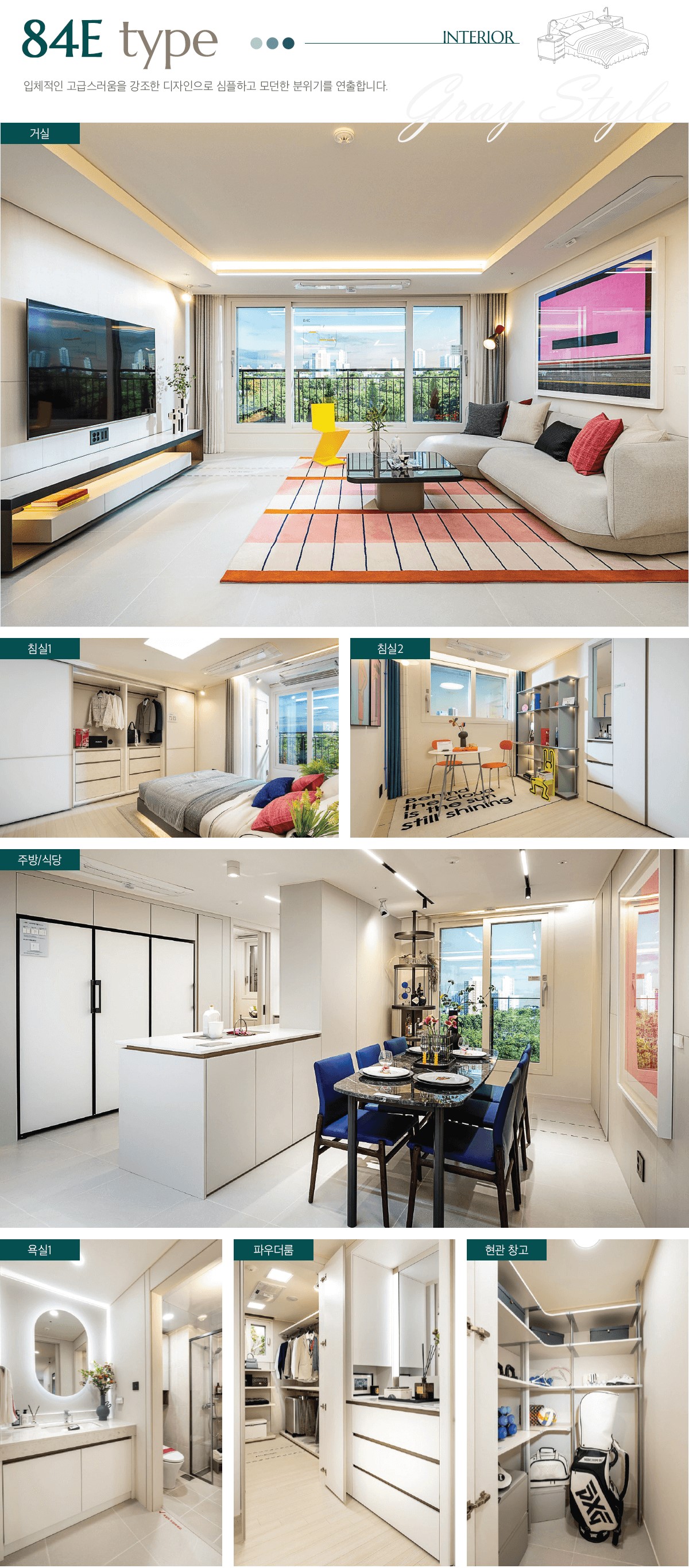 실내는 채광과 통풍을 최적화한 4베이(Bay) 구조로 설계되었으며, 다이닝룸, 팬트리, 알파룸 등을 포함한 다양한 공간이 타입별로 제공됩니다. 또한, 층간소음을 획기적으로 줄이는 '스마트 3중 바닥구조'와 최신 내진설계 기준(내진 1등급)을 적용하여 안전성을 강화하였습니다.