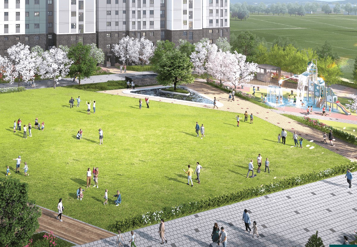 친환경을 중요시하는 이 단지는 차가 다니지 않는 대규모 잔디마당을 비롯한 조경 면적을 약 35%로 확장하여 주민들에게 자연과의 조화를 제공합니다.