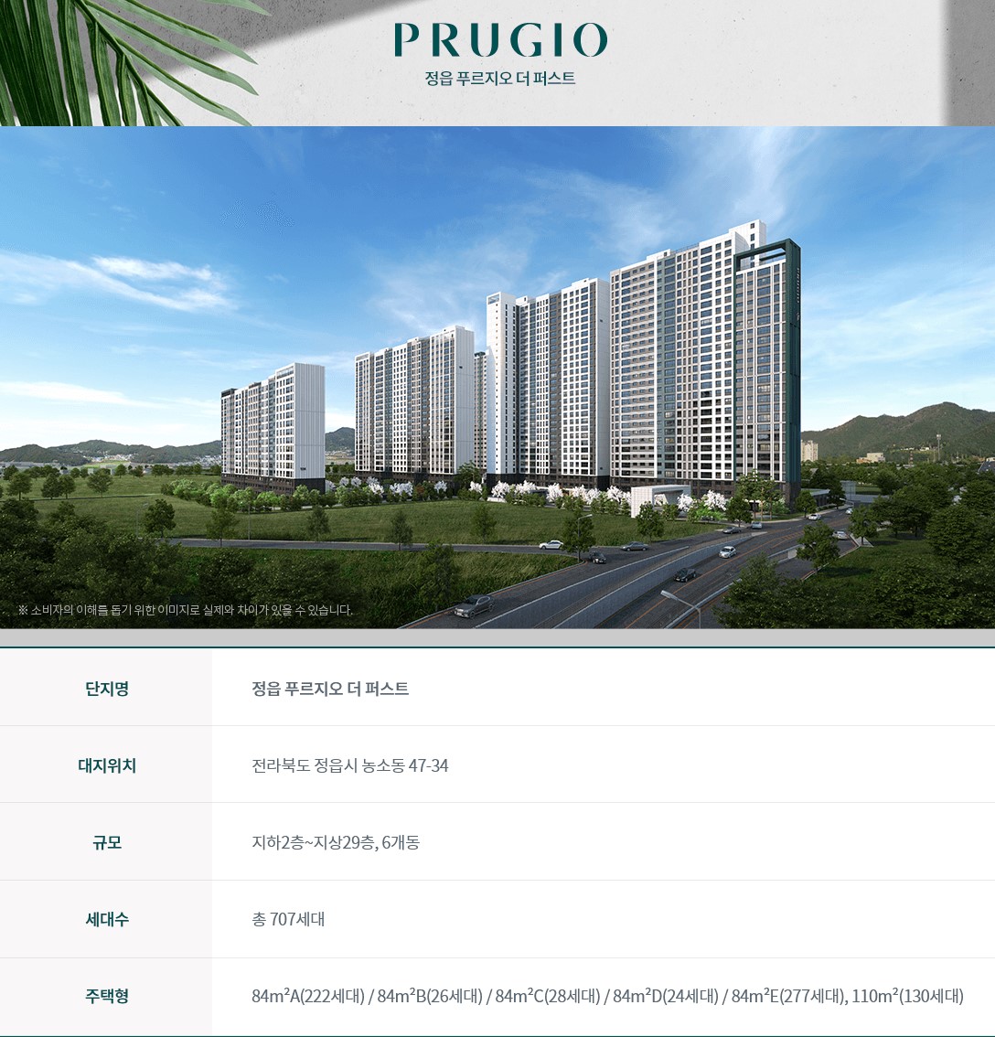 "정읍 푸르지오 더 퍼스트"는 정읍 최초의 푸르지오 단지로, 최신 아파트 디자인을 통해 입주민의 편의성을 극대화했습니다. 최대 29층의 초고층 건물은 남향을 위주로 설계되어 최상의 채광을 제공하며, 동 간 거리가 넓어 개방감을 느낄 수 있습니다.