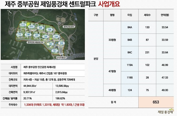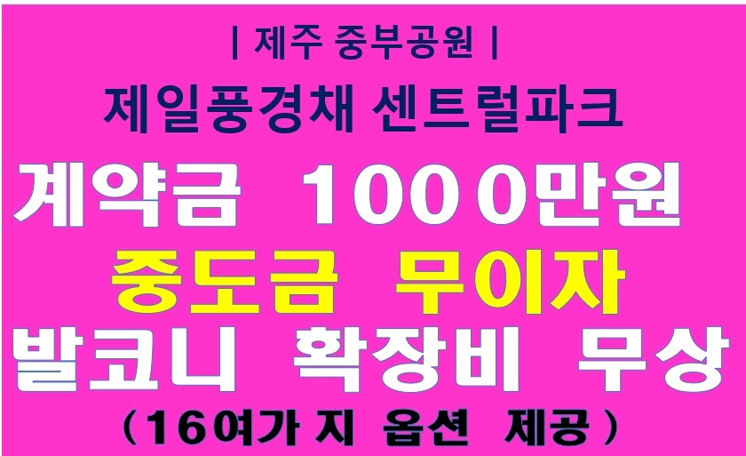 제주 중부공원 제일풍경채 센트럴파크는 제주시 건입동 일원에 지하 4층에서 지상 15층까지 12개 동, 총 728세대로 이루어진 대단지 아파트입니다. 각 세대별로 계절창고가 제공되며, 발코니 확장비 전액 무상, 16가지 무상 옵션 제공, 셔틀버스 2대 무상 제공 등의 혜택이 주어집니다. 또한, 중도금 이자 후불제에서 중도금 무이자로 변경된 파격적인 조건이 적용되어 많은 계약자들의 관심을 끌고 있습니다.